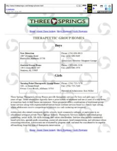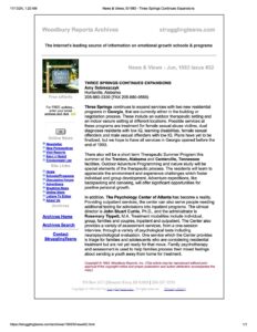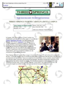 Three Springs played a significant role in the early formation and launch of the National Association of Therapeutic Schools and Programs (NATSAP), which was established in 1999 and has since become notorious for abusive member programs.7 Three Springs was identified as one of the six founding programs that provided initial seed money and support to launch NATSAP.8
